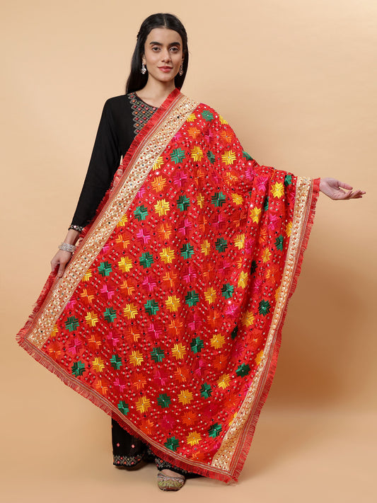 Red Multicolor Phulkari Dupattawith Mirror Work | MCMMPD0293