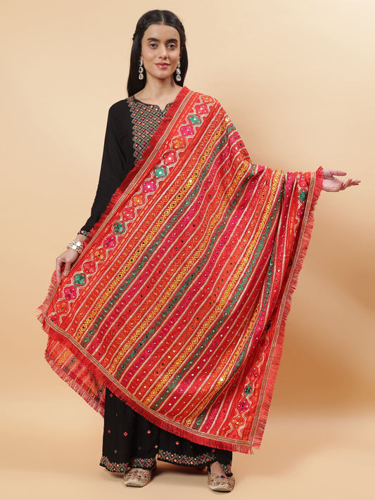Red Multicolor Striped Pattern Phulkari Dupatta with Mirror Work | MCMMPD0273