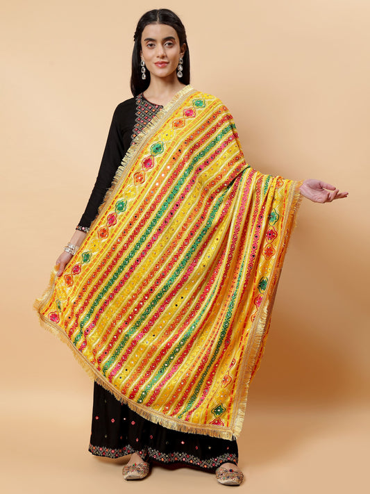 Yellow Multicolor Striped Pattern Phulkari Dupatta with Mirror Work | MCMMPD0279