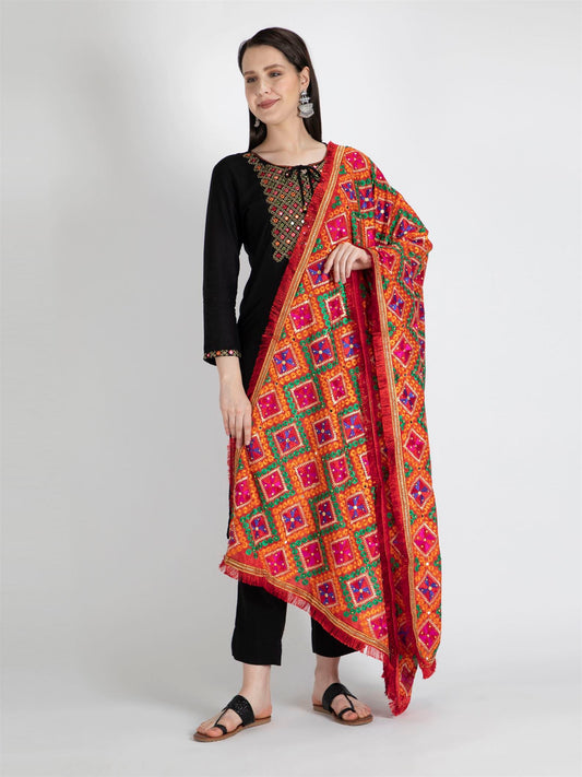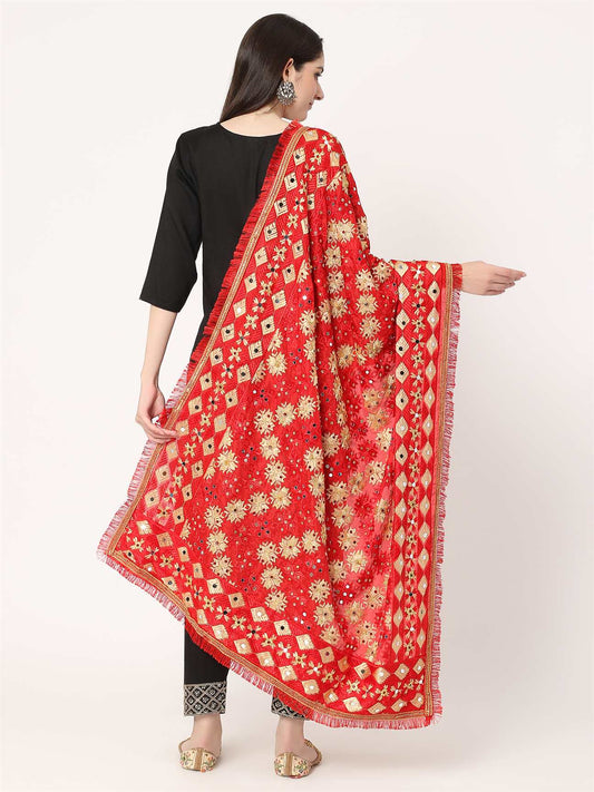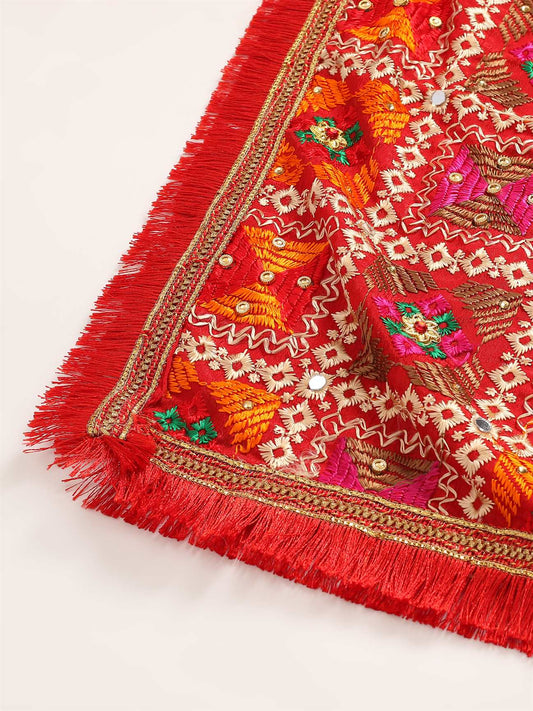 Red Embroidery Phulkari Dupattai With Mirror Work | MCRCPD0133