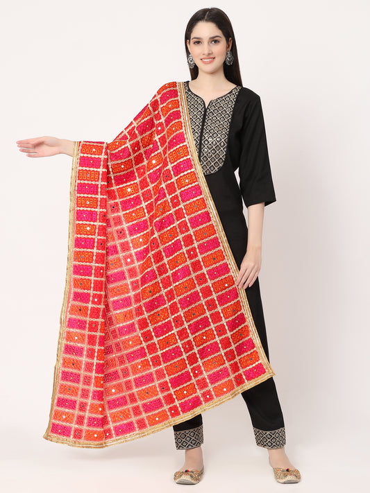 Red Geometric Design Phulkari Dupatta with Mirror Work | MCMMPD0313