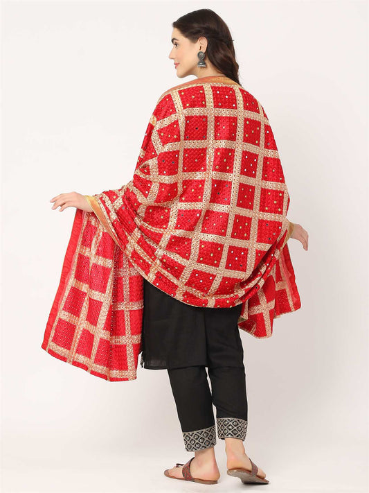 Red Embroidery Check Phulkari Dupatta with Mirror | MCRCPD0145