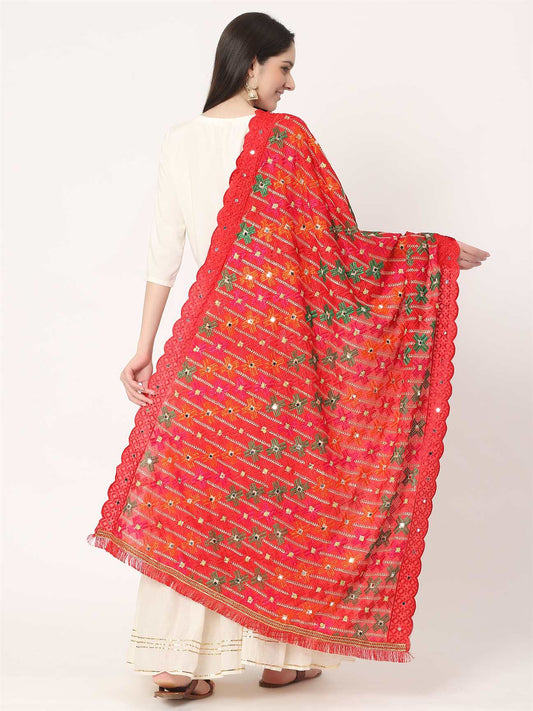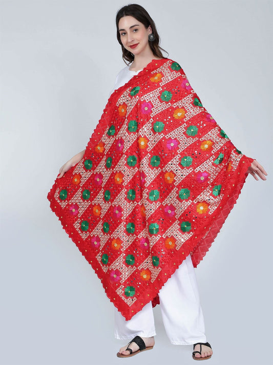 Red Multicolour Embroidery Phulkari Dupatta with Mirror Work | MCRCPD0211C