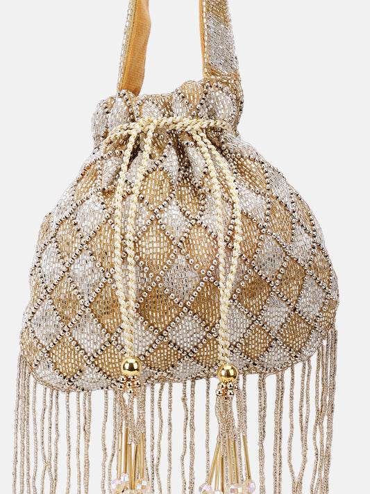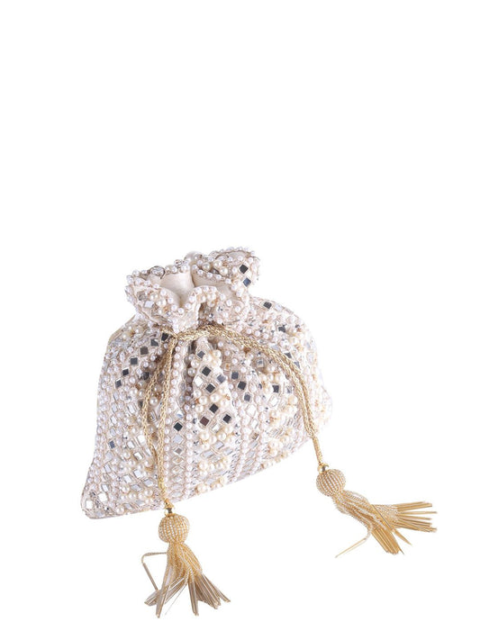 Ivory Lume Mirror Embellished Potli Bag – Golden Grace (9 x 8.5 in)