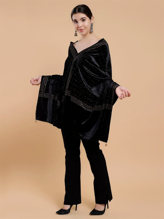 Black Embellished Velvet Stole - MCHSVD1611BK