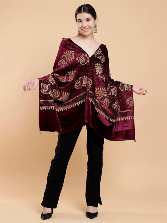 Burgundy Embellished Velvet Stole - MCHSVD1630W