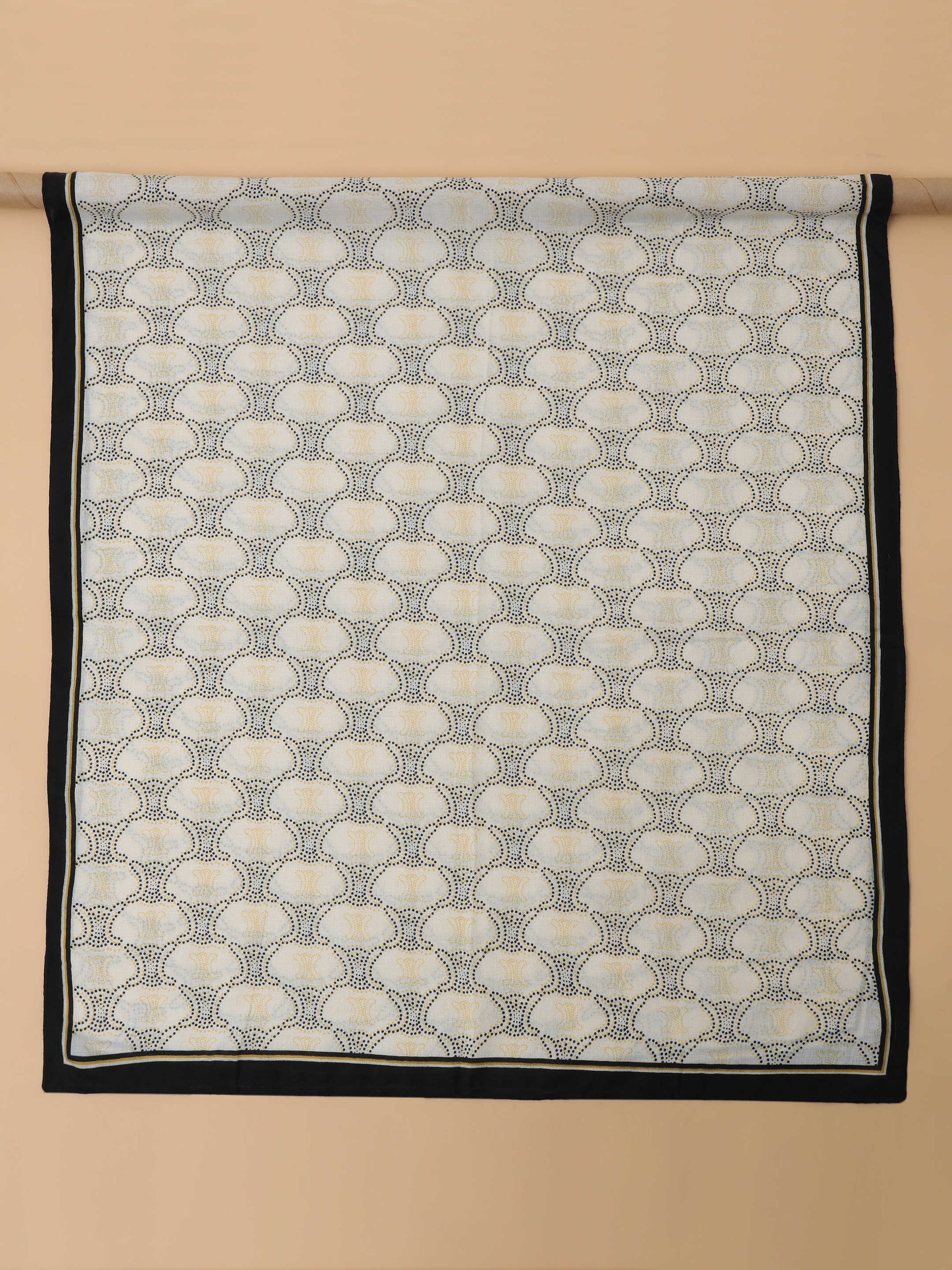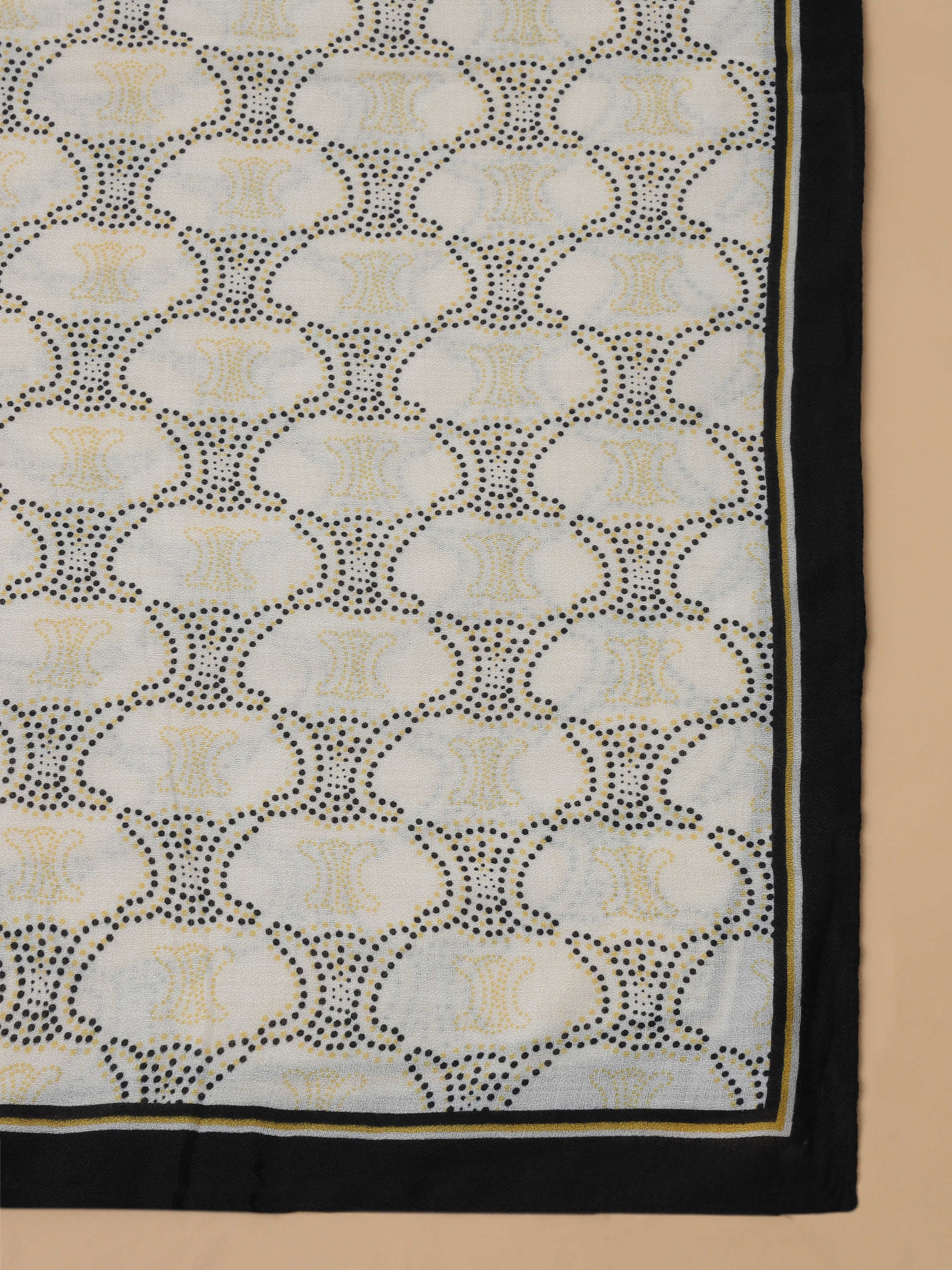 This scarf features a sophisticated geometric pattern formed by delicate black and golden yellow dots on an off-white base, framed with a bold black border and subtle gold detailing. Whether paired with casual wear or dressed up for special occasions, this scarf offers both comfort and versatility. The soft viscose fabric ensures a smooth, breathable feel against the skin—similar in softness to cotton, but with a silkier, lighter drape. This makes it ideal for year-round use, providing the coolness and comfort you expect from cotton, with the added elegance and fluidity of viscose.