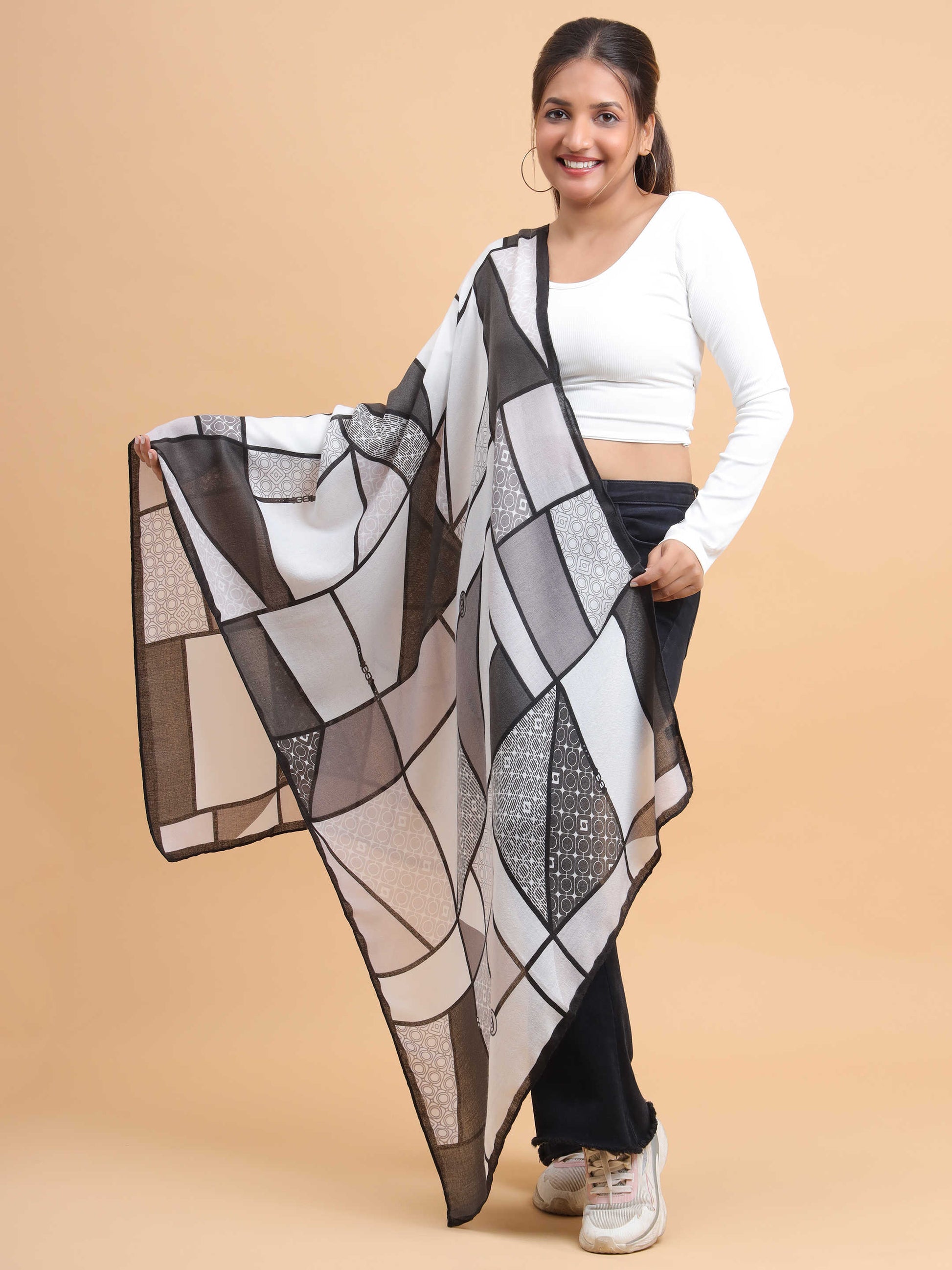 Elevate your style with the Black & Grey Abstract Geometric 100% Viscose Scarf. Measuring 85 x 190 cm, this scarf features a modern abstract geometric design in shades of black, grey, and white, with intersecting lines and varied patterns within each segment. The bold black outlines and intricate motifs create a sophisticated, contemporary look that pairs effortlessly with both casual and formal outfits. Crafted from lightweight, breathable viscose, this scarf drapes smoothly and feels soft against the skin. Whether paired with casual wear or dressed up for special occasions, this scarf offers both comfort and versatility. The soft viscose fabric ensures a smooth, breathable feel against the skin—similar in softness to cotton, but with a silkier, lighter drape. This makes it ideal for year-round use, providing the coolness and comfort you expect from cotton, with the added elegance and fluidity of viscose.