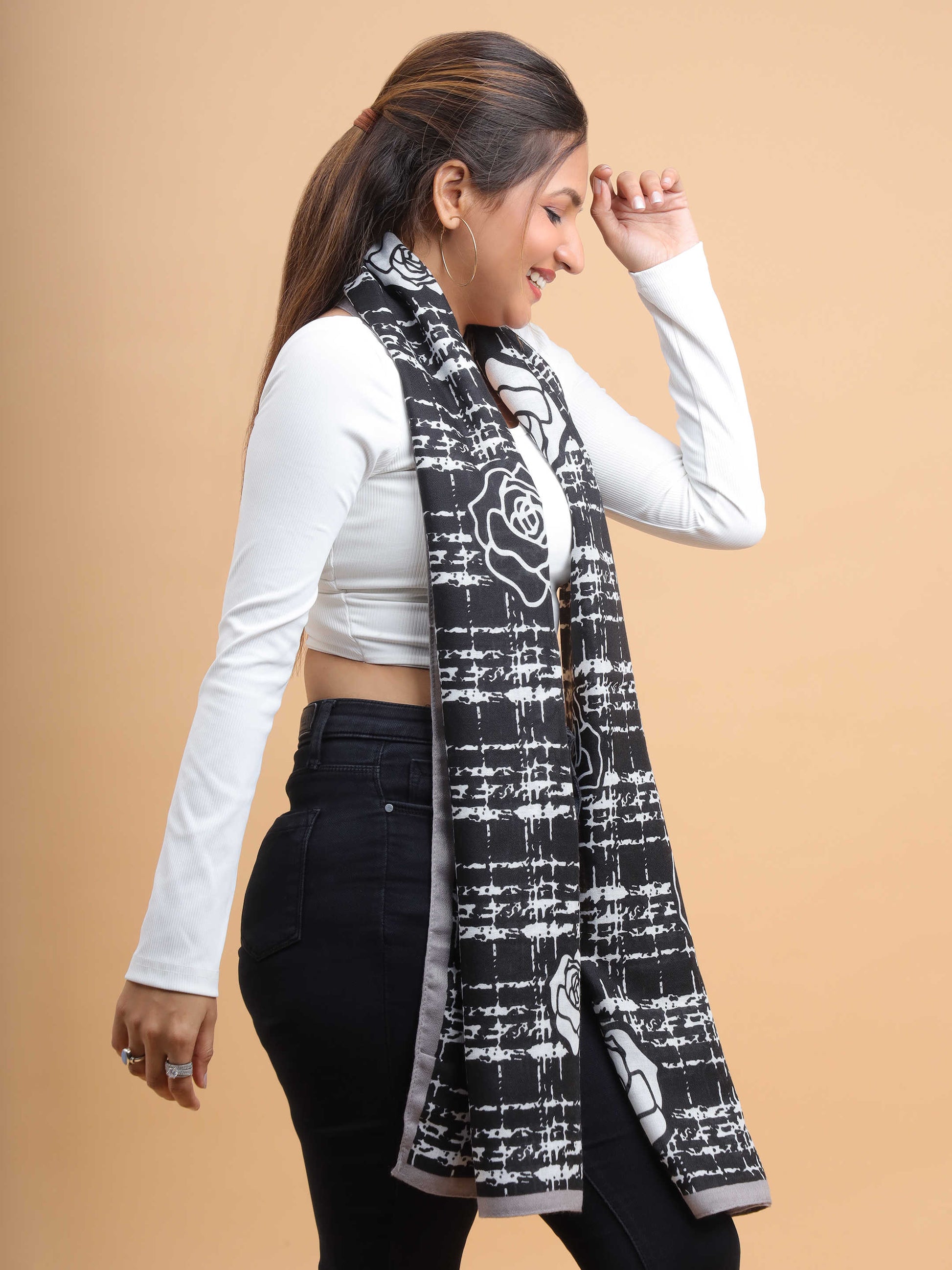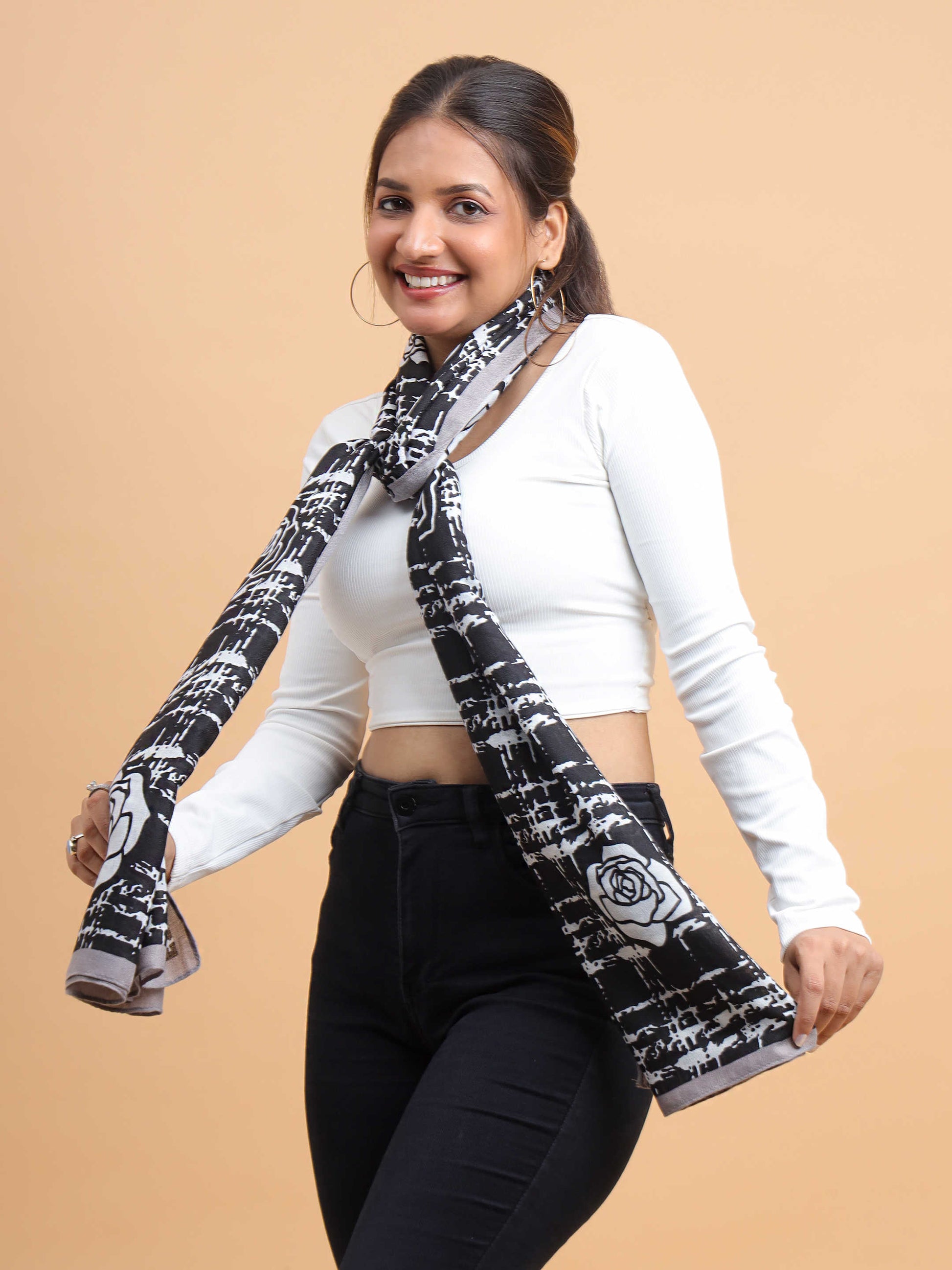 Add a sophisticated touch to your ensemble with the Black & Grey Rose Grid 100% Viscose Scarf. Measuring 85 x 190 cm, this scarf features a bold black base with an abstract white grid pattern, beautifully accented by large, stylized grey rose motifs scattered across the fabric. The design is finished with a soft grey border, giving it a refined and versatile look. Crafted from lightweight, breathable viscose, this scarf drapes gracefully and feels soft against the skin—perfect for both casual and formal occasions. Whether paired with casual wear or dressed up for special occasions, this scarf offers both comfort and versatility. The soft viscose fabric ensures a smooth, breathable feel against the skin—similar in softness to cotton, but with a silkier, lighter drape. This makes it ideal for year-round use, providing the coolness and comfort you expect from cotton, with the added elegance and fluidity of viscose.