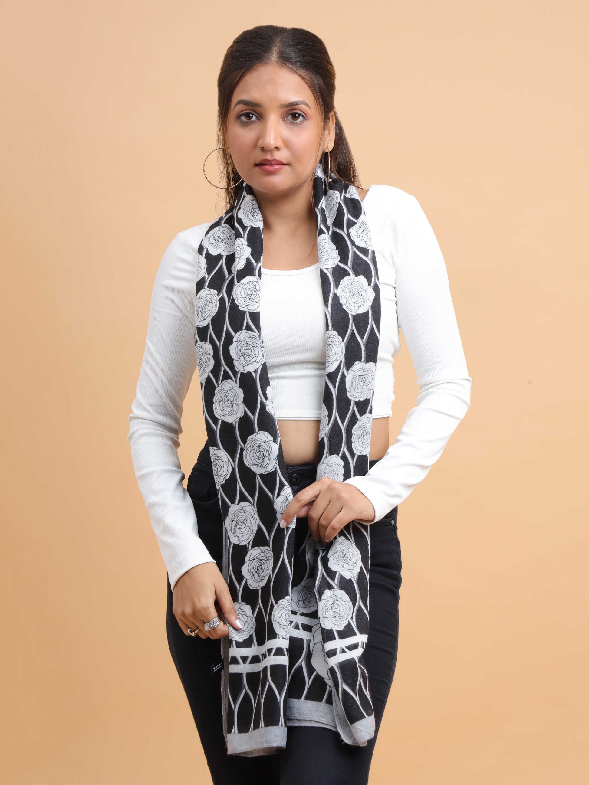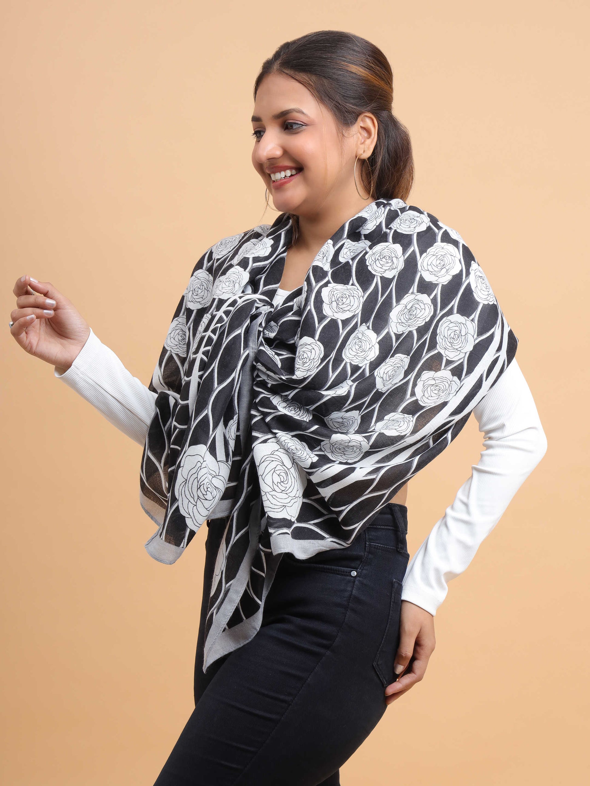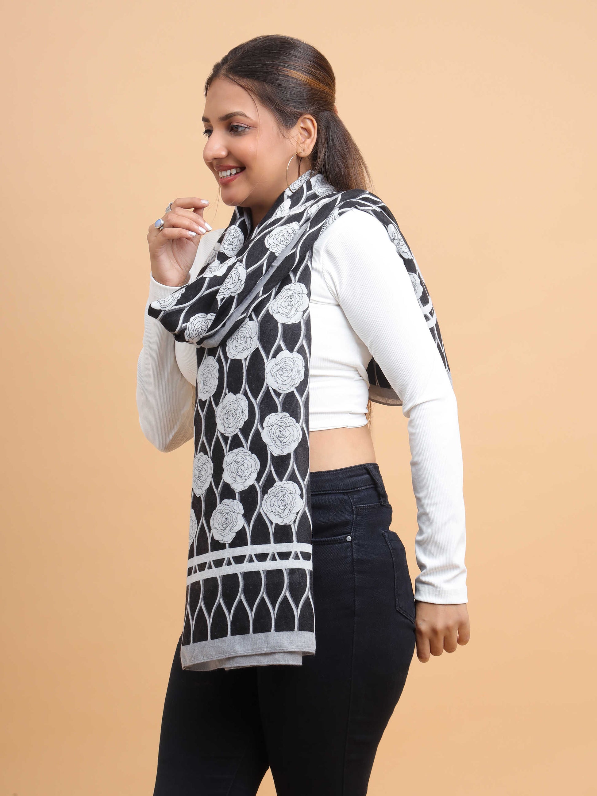 Add a touch of modern elegance to your wardrobe with the Black & White Floral Lattice 100% Viscose Scarf. Measuring 85 x 190 cm, this scarf features a striking black base adorned with a delicate white floral motif arranged in a geometric lattice pattern. The design is framed by a soft grey border, enhancing its sophisticated appeal. Crafted from lightweight, breathable viscose, this scarf drapes beautifully and feels luxuriously soft against the skin—perfect for both casual and formal occasions. Whether paired with casual wear or dressed up for special occasions, this scarf offers both comfort and versatility. The soft viscose fabric ensures a smooth, breathable feel against the skin—similar in softness to cotton, but with a silkier, lighter drape. This makes it ideal for year-round use, providing the coolness and comfort you expect from cotton, with the added elegance and fluidity of viscose.
