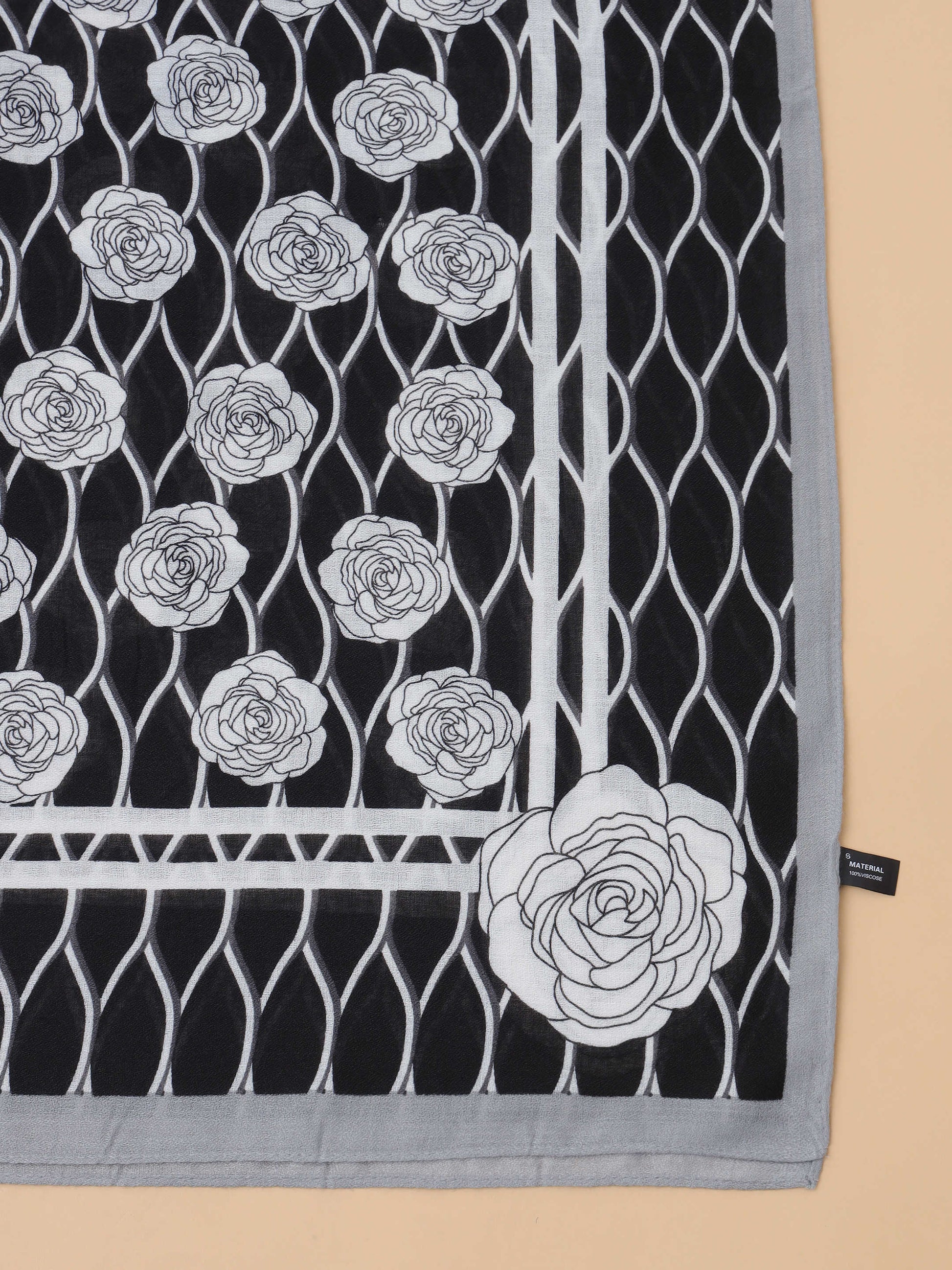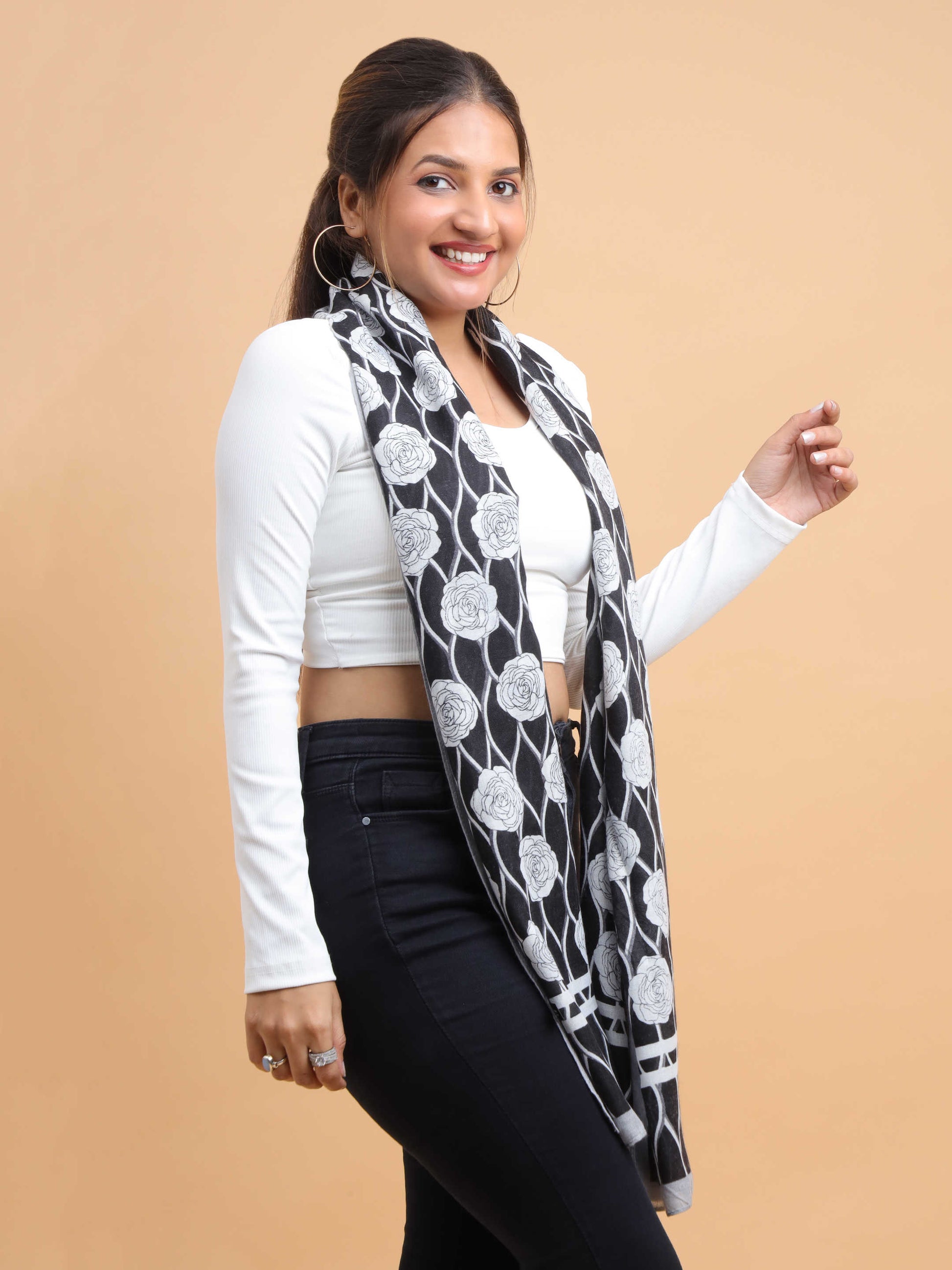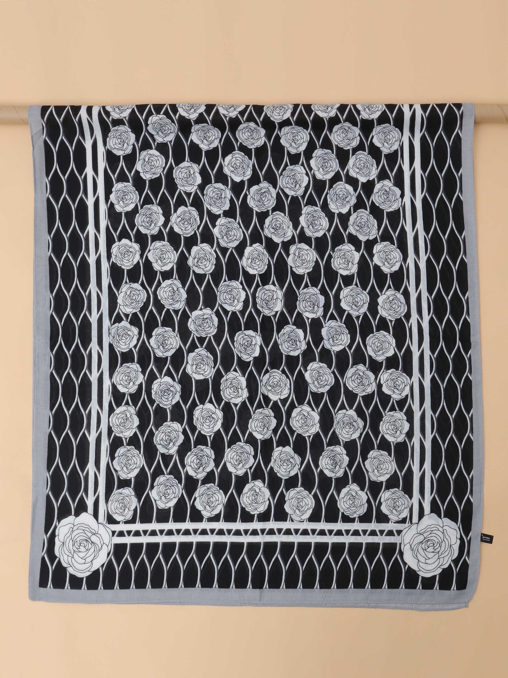 Add a touch of modern elegance to your wardrobe with the Black & White Floral Lattice 100% Viscose Scarf. Measuring 85 x 190 cm, this scarf features a striking black base adorned with a delicate white floral motif arranged in a geometric lattice pattern. The design is framed by a soft grey border, enhancing its sophisticated appeal. Crafted from lightweight, breathable viscose, this scarf drapes beautifully and feels luxuriously soft against the skin—perfect for both casual and formal occasions. Whether paired with casual wear or dressed up for special occasions, this scarf offers both comfort and versatility. The soft viscose fabric ensures a smooth, breathable feel against the skin—similar in softness to cotton, but with a silkier, lighter drape. This makes it ideal for year-round use, providing the coolness and comfort you expect from cotton, with the added elegance and fluidity of viscose.