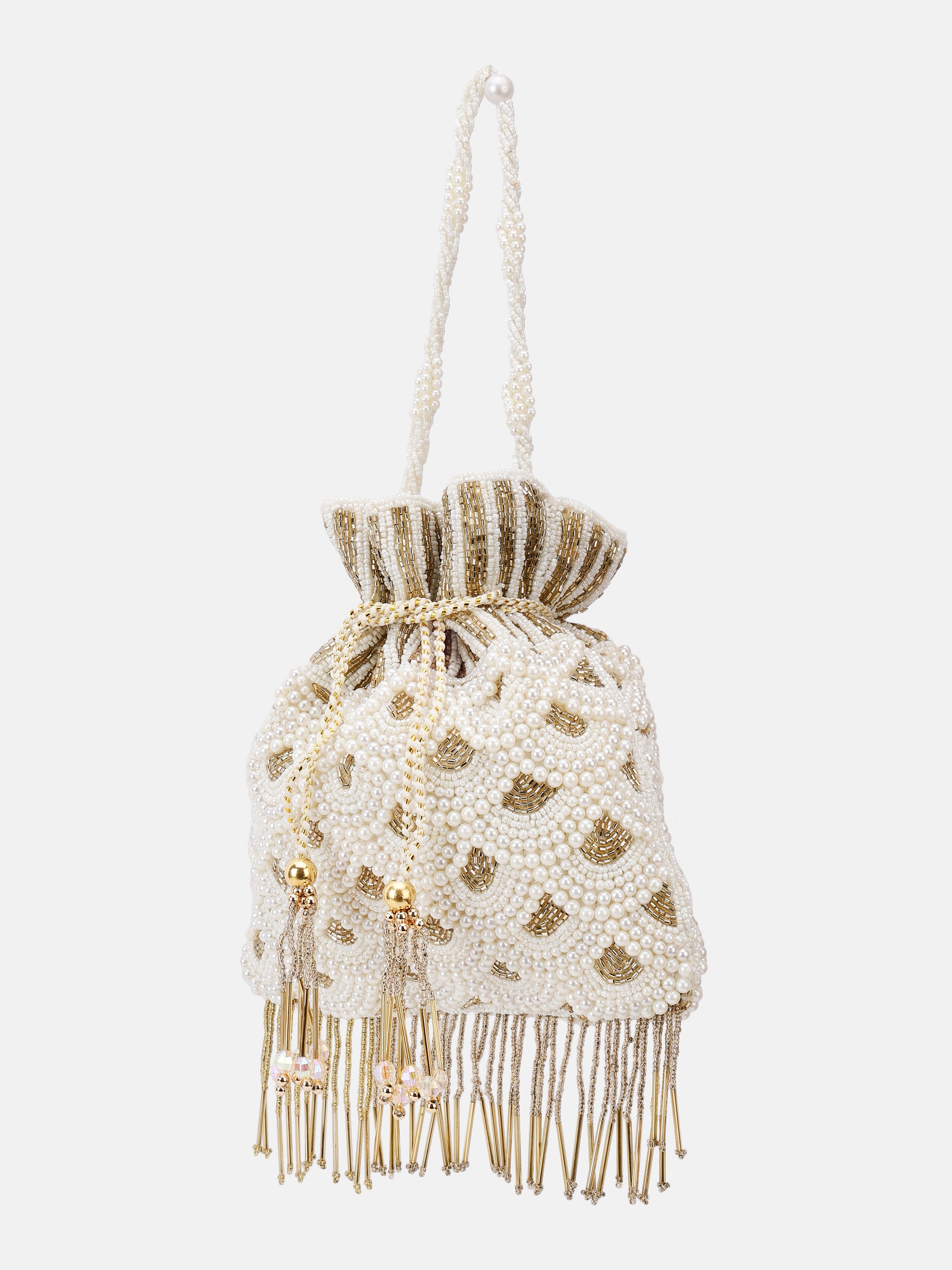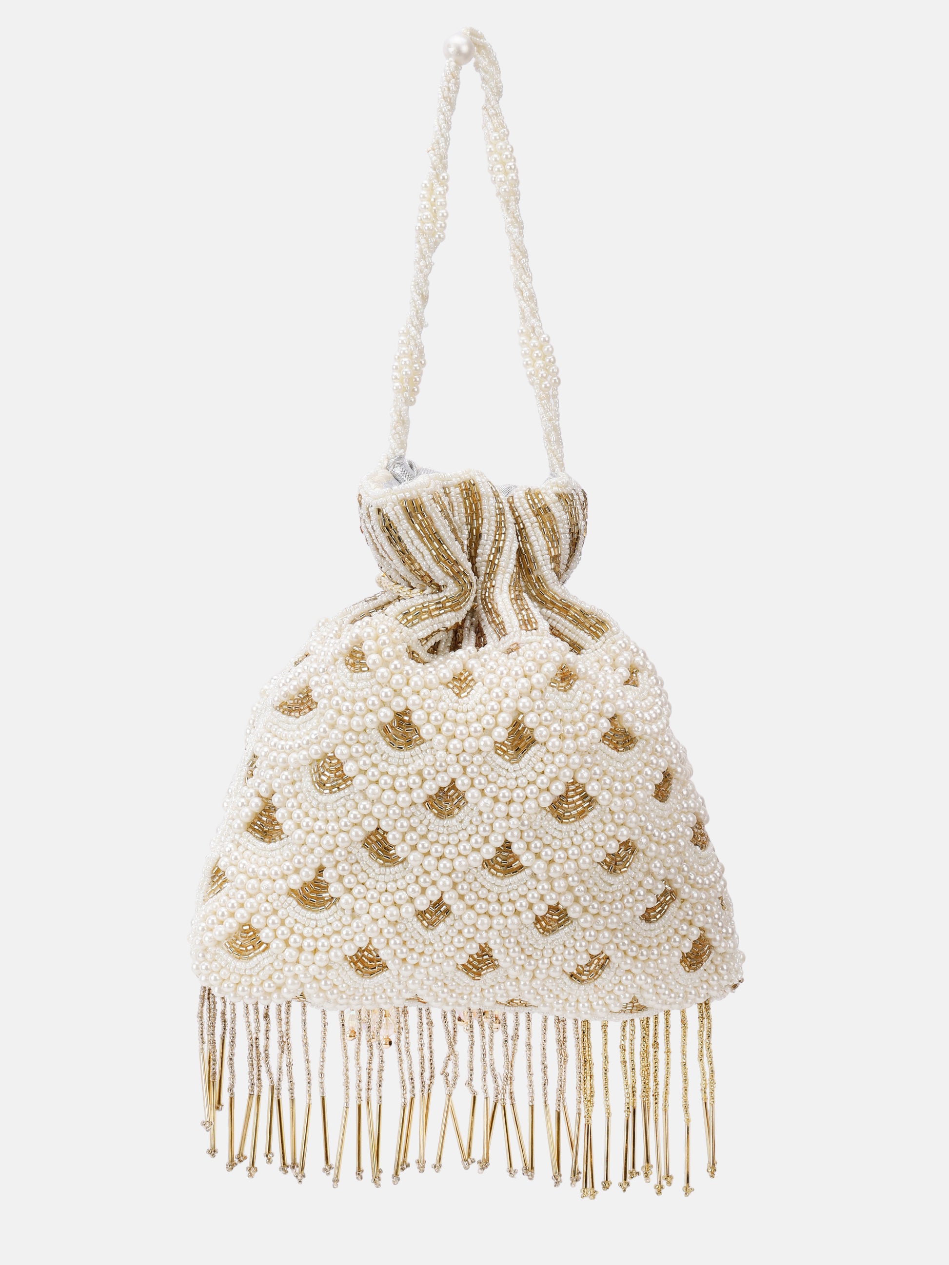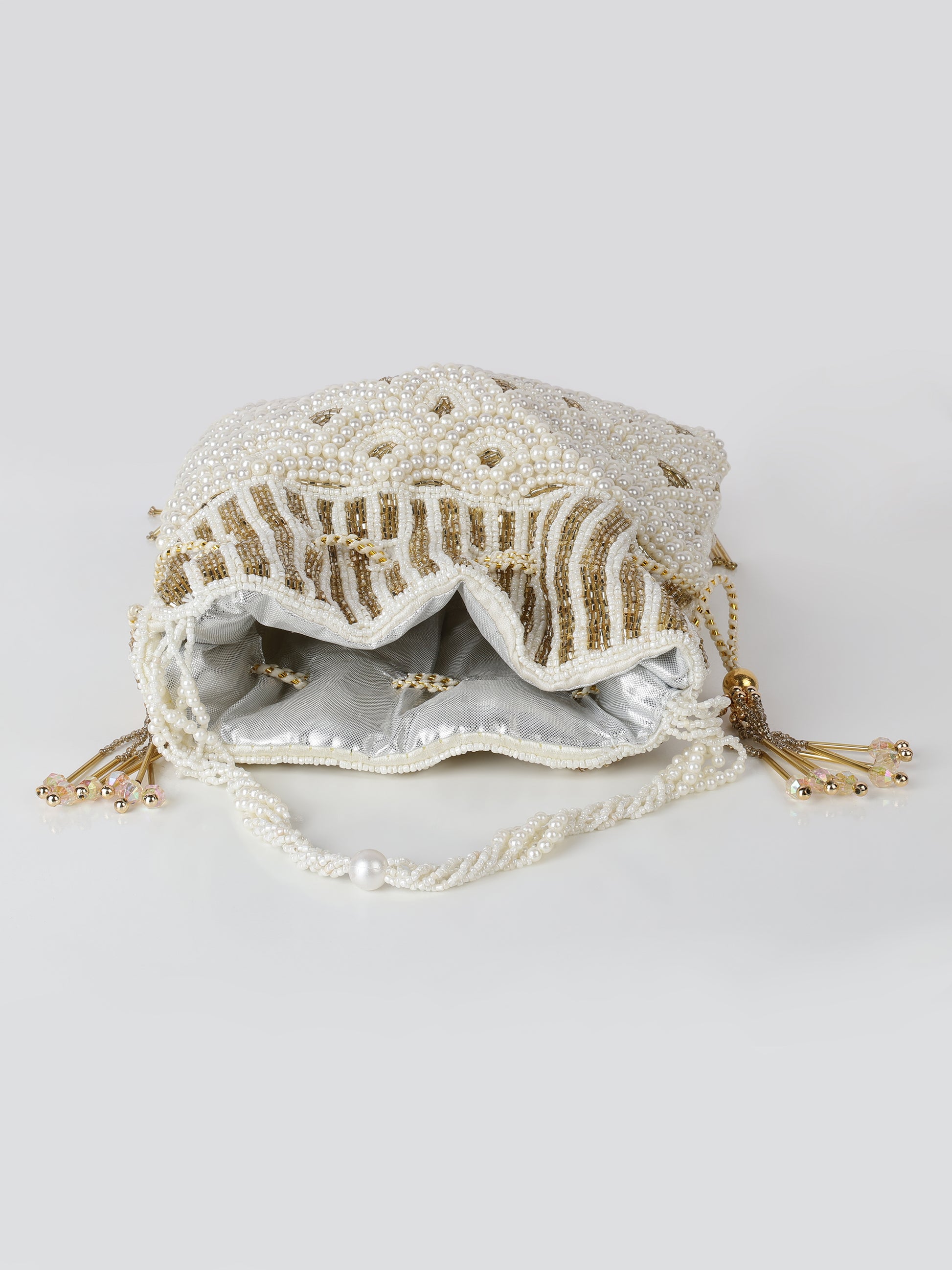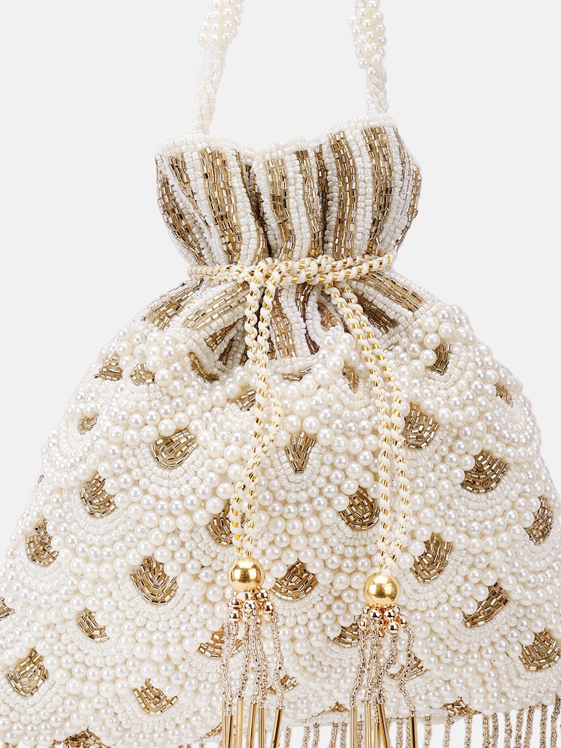 Step into a world of timeless elegance with our exquisite handmade beaded bridal potli bag in radiant white and gold hues. Crafted with meticulous attention to detail, this enchanting accessory seamlessly blends tradition with modernity. Each shimmering bead has been carefully selected and hand-sewn, forming a dazzling mosaic of gold and silver tones that catch the light beautifully with every movement.