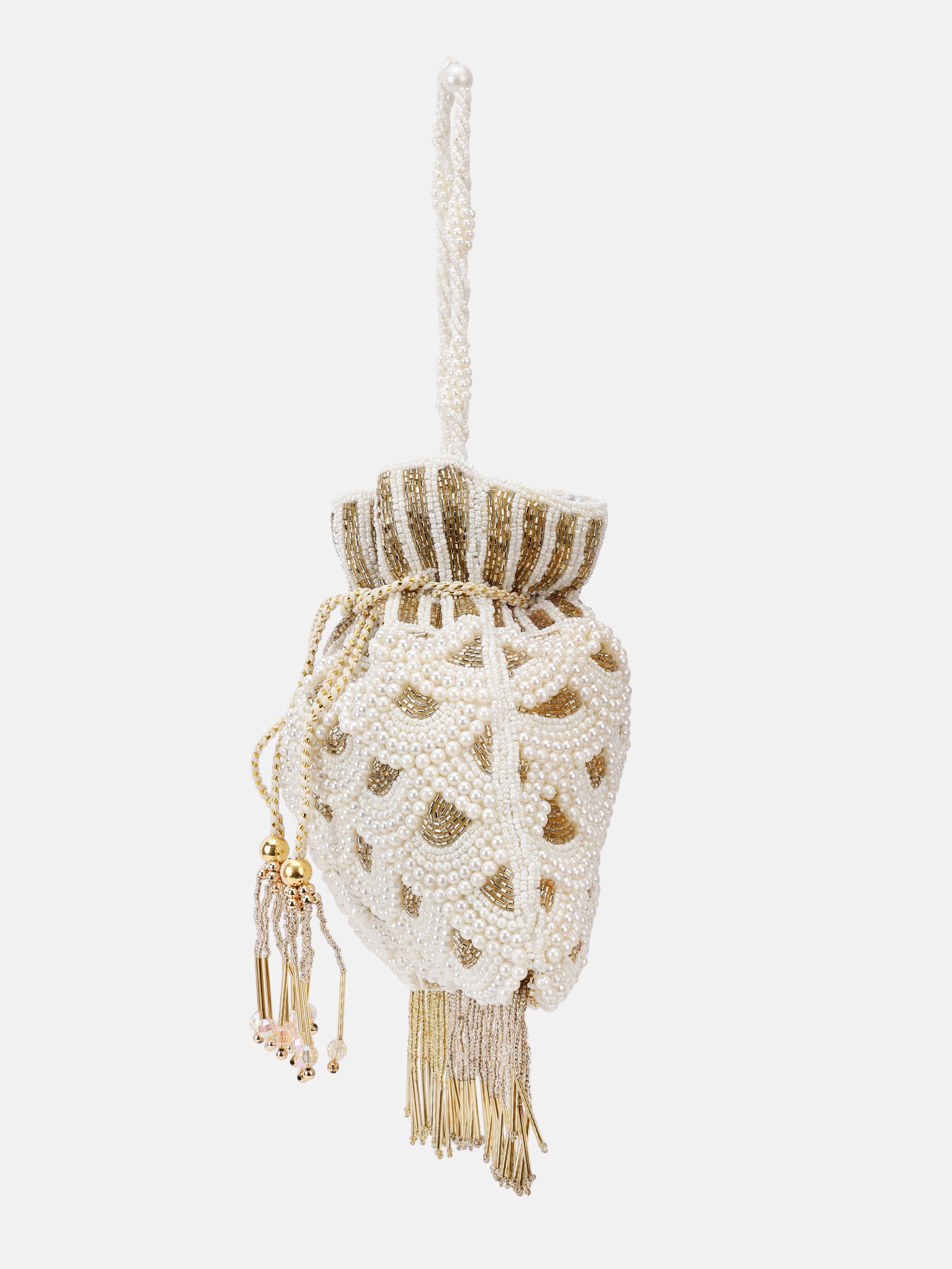 Elevate your bridal ensemble with the luminous charm of this gold and white handmade potli bag. More than just an accessory, it's a timeless keepsake that symbolizes the elegance of tradition and the sparkle of new beginnings. Whether carried by hand or gracefully draped over the wrist, this beaded bridal potli bag is a masterpiece of craftsmanship and sophistication, destined to be treasured for years to come.