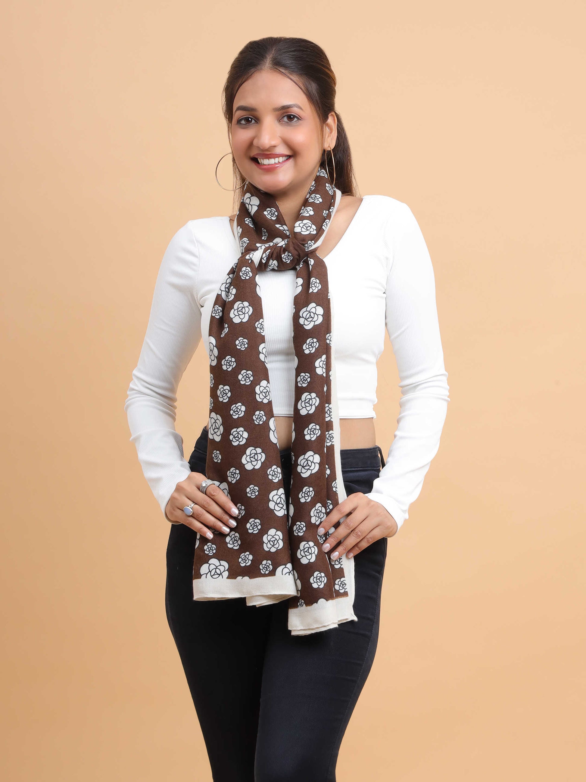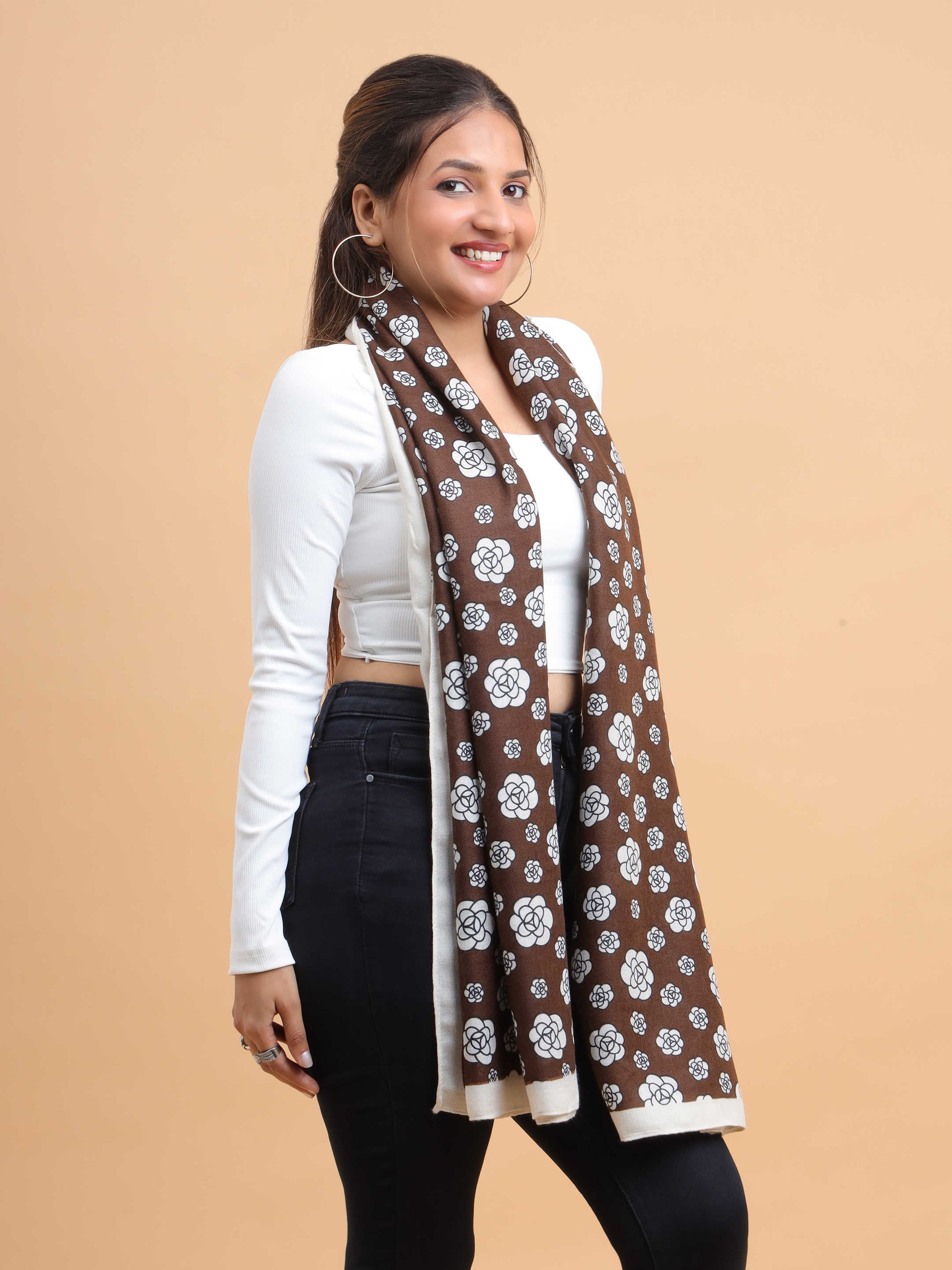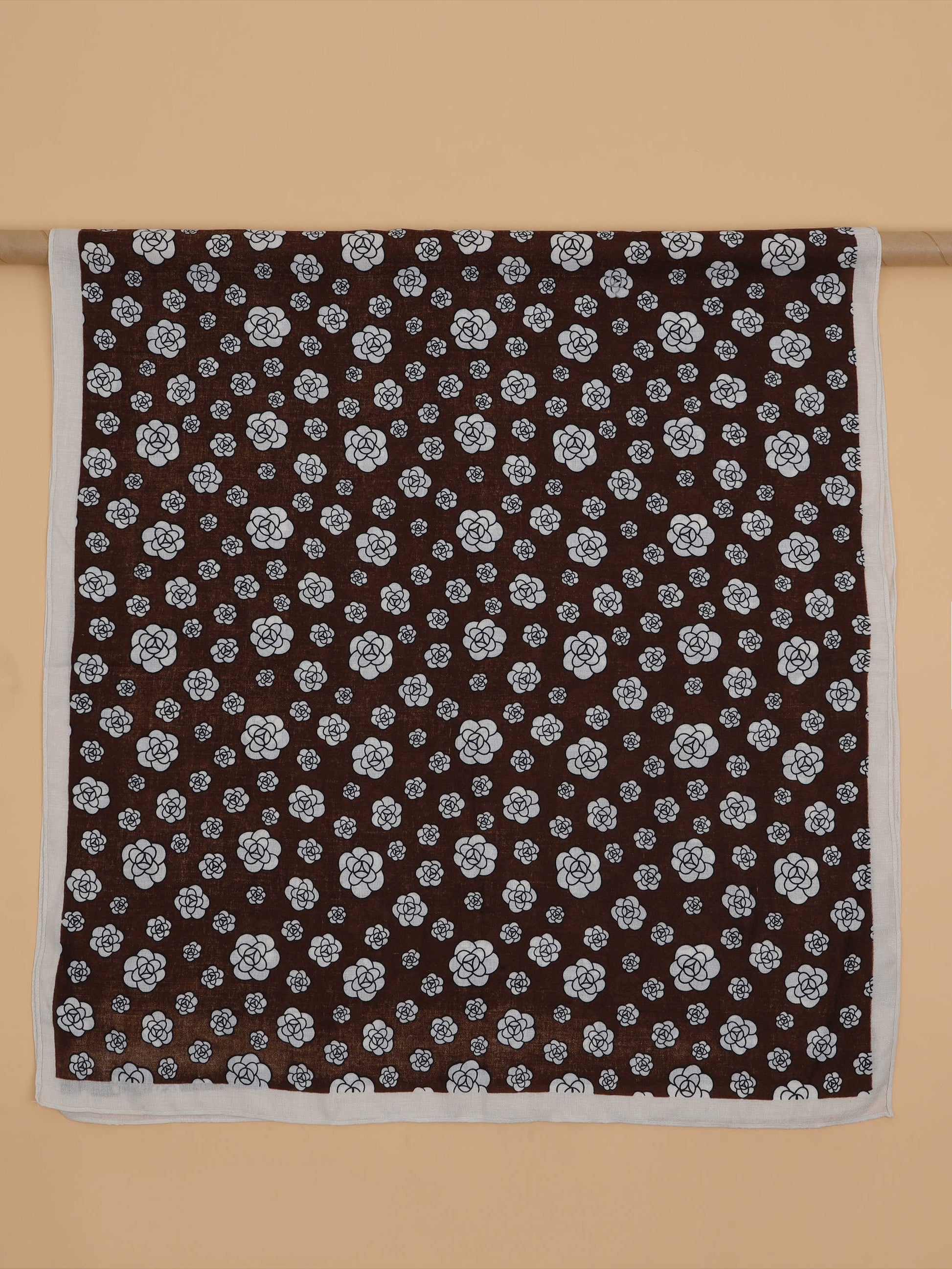 Brown & White Floral Motif 100% Viscose Scarf