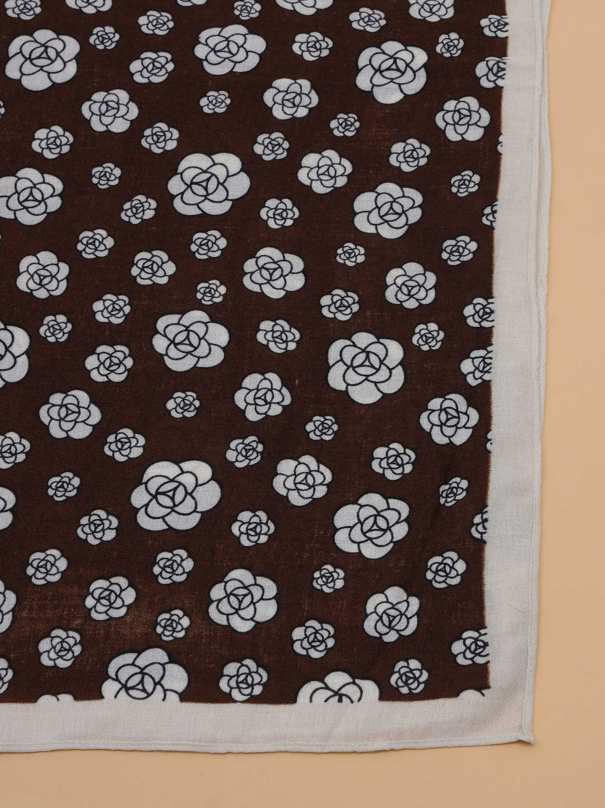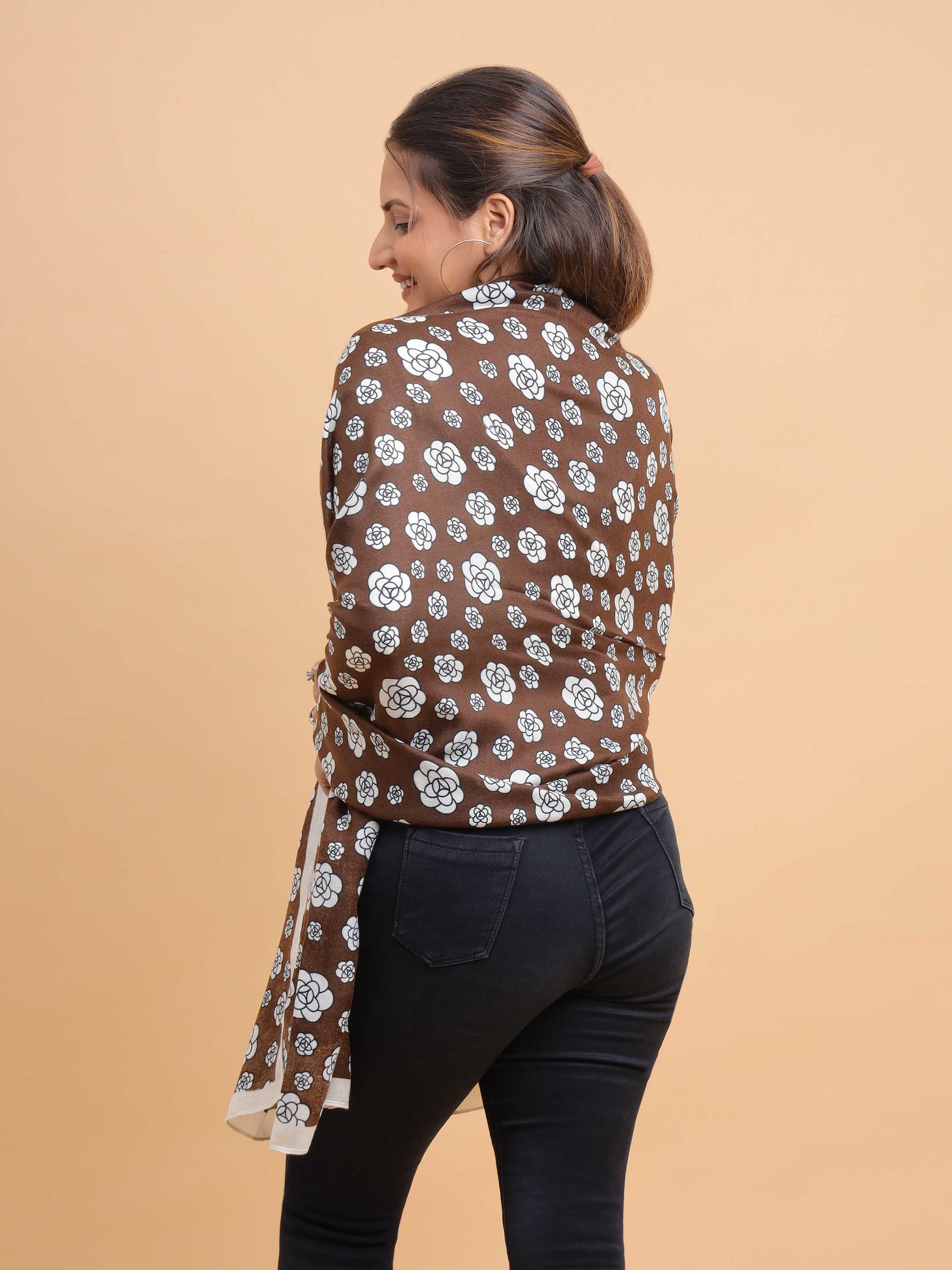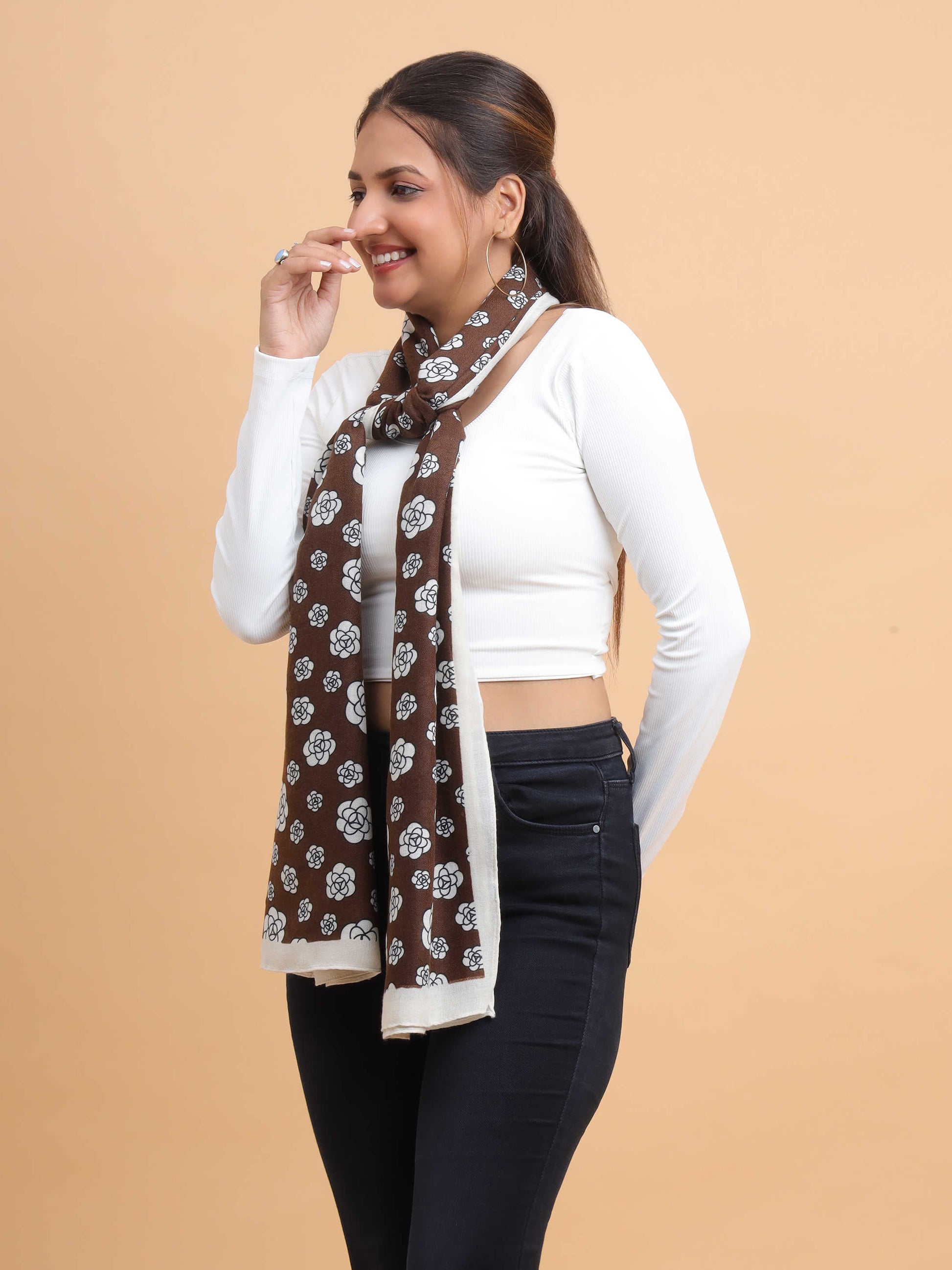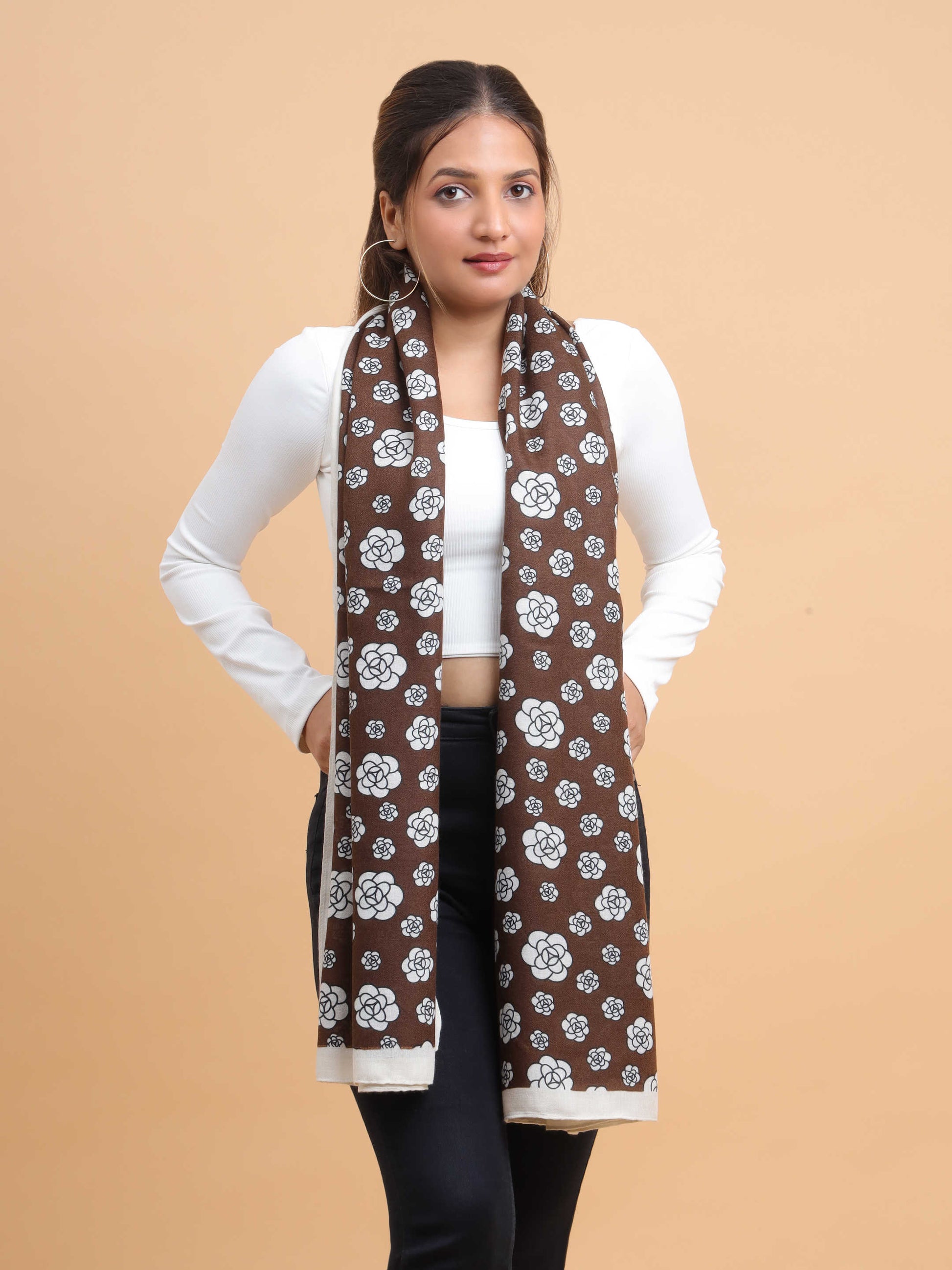 Brown & White Floral Motif 100% Viscose Scarf