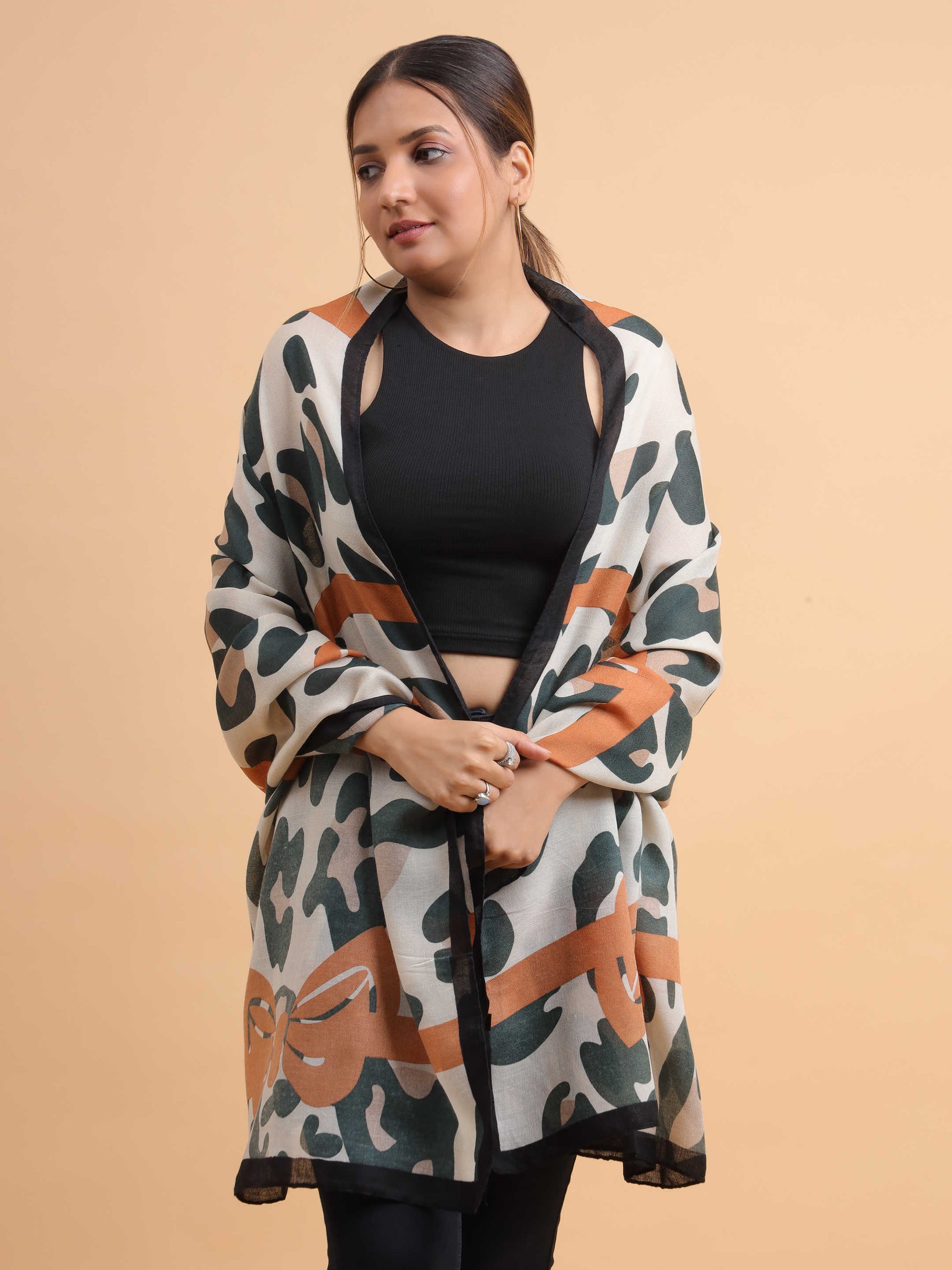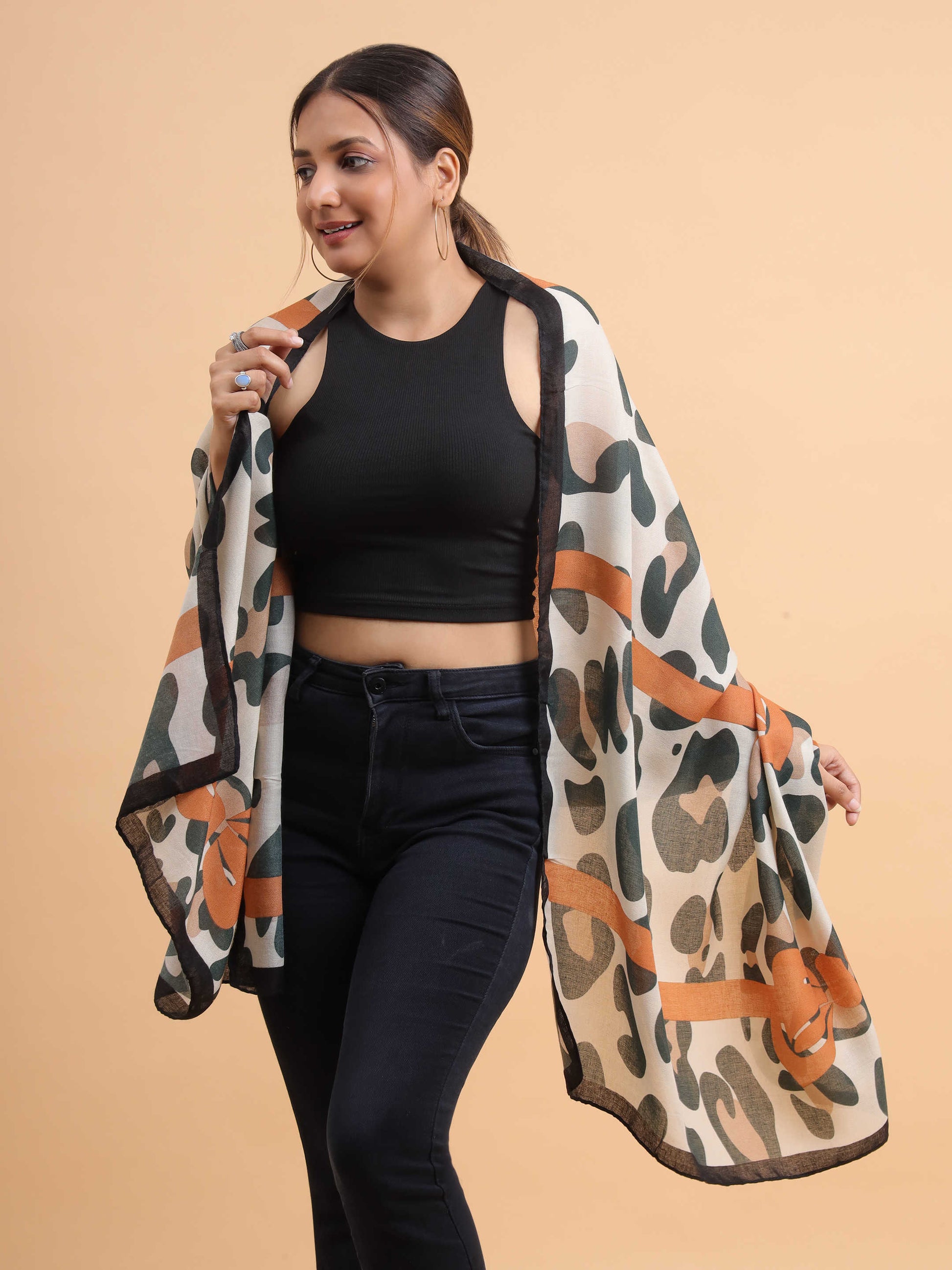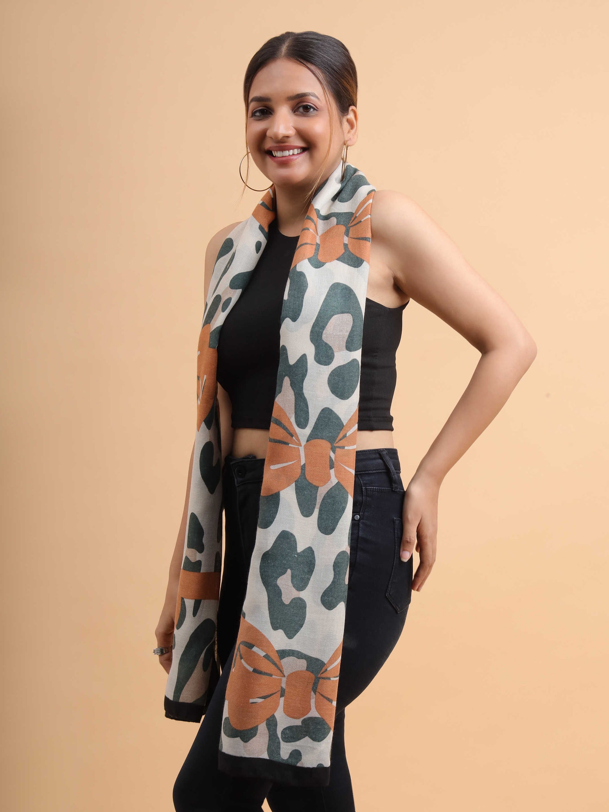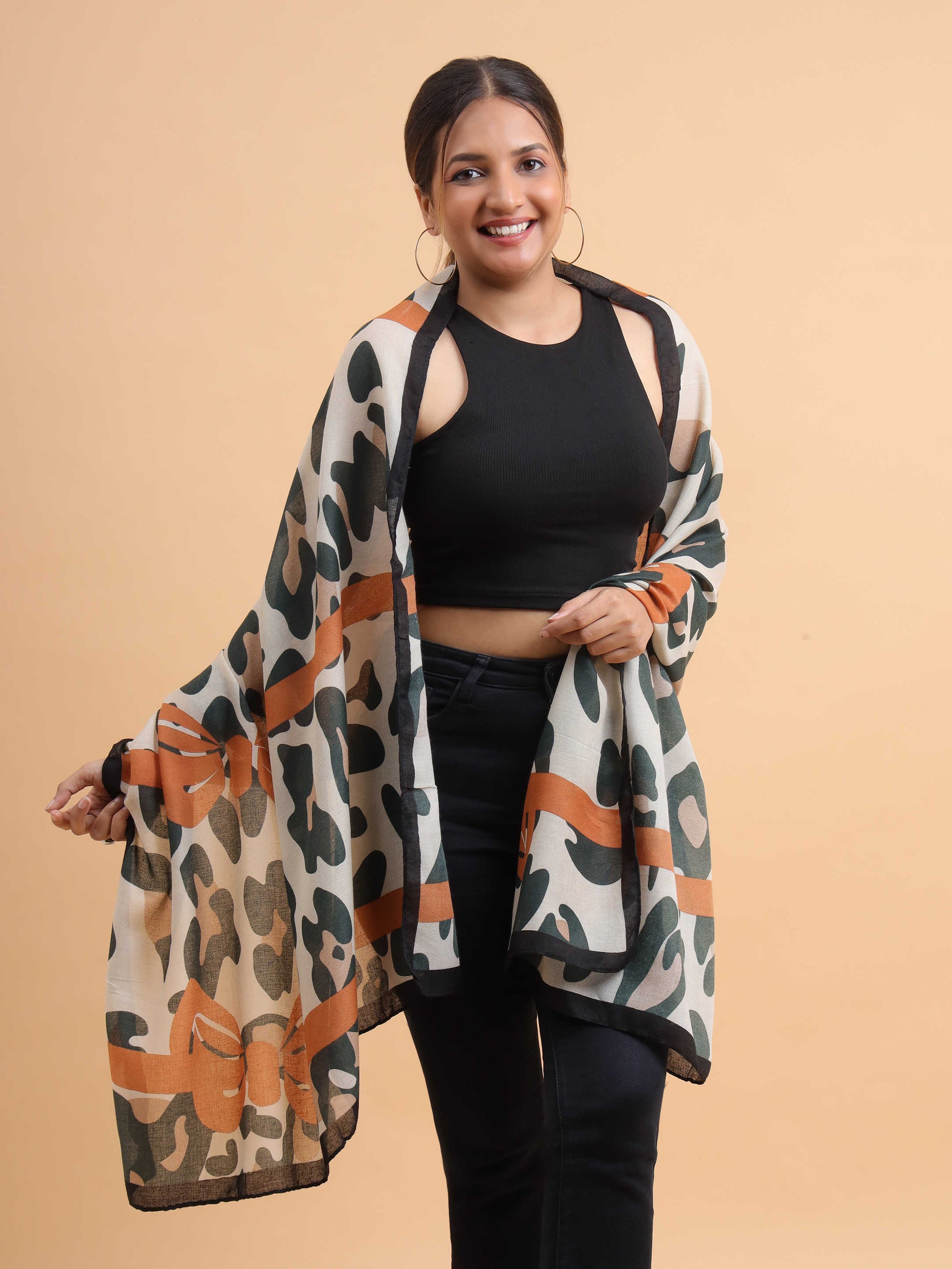 Make a bold statement with this Leopard Bow Print 100% Viscose Scarf. Measuring 85 x 190 cm, this scarf features an eye-catching leopard print in green, black accented with stylish rust-orange bow motifs and stripes. The lightweight viscose fabric provides a soft, airy feel, ensuring comfort and effortless draping for any occasion. Whether paired with casual wear or dressed up for special occasions, this scarf offers both comfort and versatility. The soft viscose fabric ensures a smooth, breathable feel against the skin—similar in softness to cotton, but with a silkier, lighter drape. This makes it ideal for year-round use, providing the coolness and comfort you expect from cotton, with the added elegance and fluidity of viscose.