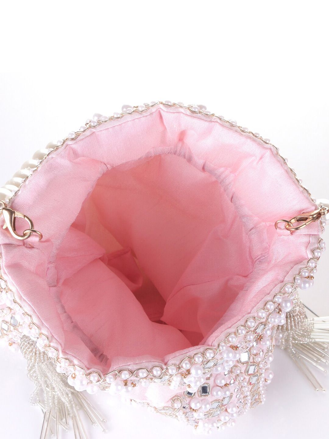 What truly sets this bag apart is its pearl-beaded handle, designed to sit delicately on your wrist or be held as a statement accessory. Whether you're attending a wedding, reception, or festive soirée, this potli brings together softness and sparkle in perfect harmony.